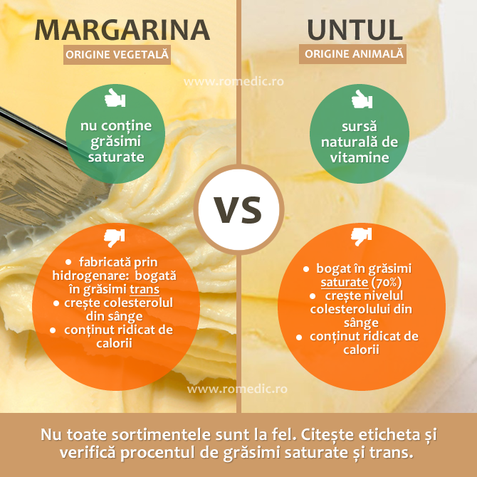 Atenție, însă! Nu toate tipurile de margarină sunt la fel. Unele dintre sortimente, în special cele mai vechi (ca formulă) pot fi chiar mai rele decât untul. Explicația? Majoritatea margarinelor sunt fabricate printr-o metodă numită hidrogenare, care adaugă grăsimi trans, extrem de nesănătoase pentru artere și inimă.