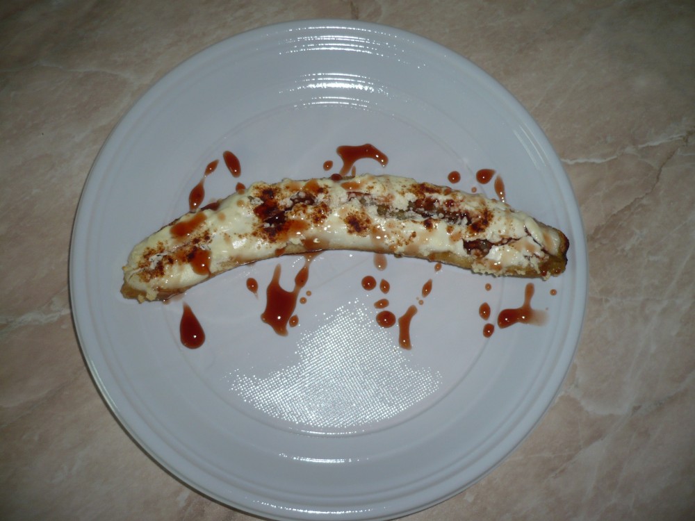 Se taie banana in doua,pe lung, si se scobeste mijlocul, astfel incat sa ramana loc pentru a pune branzica in scobitura.Se unge o tava sau un vas yena cu putin ulei (ca pentru o prajitura), si se aseaza jumatatile de banana pe tava.