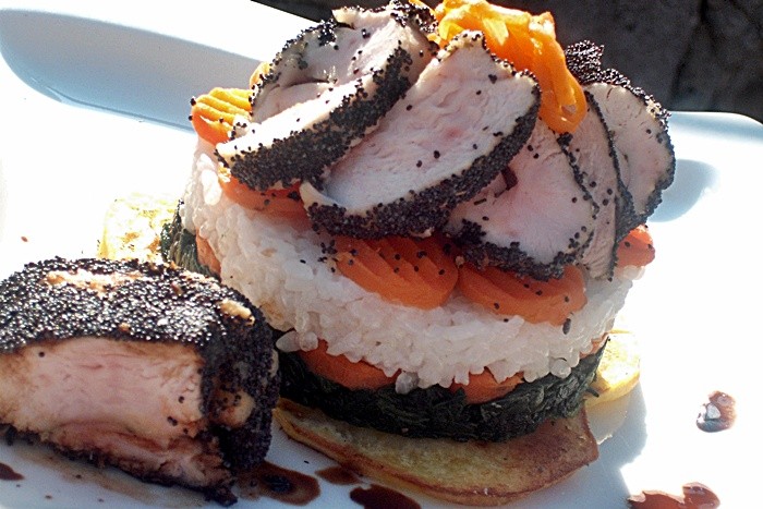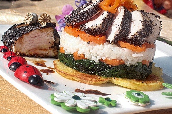 3. Se monteaza pe platou 3-4 rondele de cartof fiert (eu le-am rumenit un pic la cuptor) apoi spanacul calit ,deasupra un strat de rondele subtiri de morcov,deasupra se aseaza orezul fiert,iar un strat de rondele de morcov si la urma feliute subtiri taiate din pieptul de pui in crusta de mac.