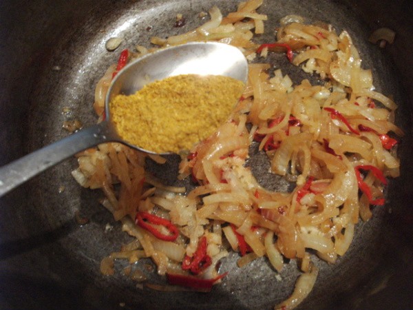 Adaugati cili, usturoi, praful curry, scortisoara si prajiti 2 minute.