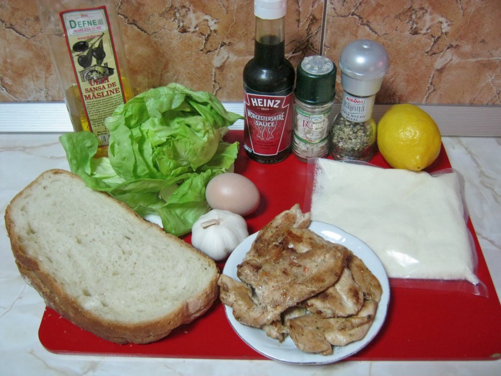 Intr-un castron mai mare punem ingredientele in urmatoarea ordine: salata, pieptul de pui, oul taiat si el cubulete si crutoanele.Amestecam apoi adaugam usturoiul, sare, piper, zeama de lamaie ramasa ,2 linguri ulei de masline , sosul Worcestershire si amestecam iar usurel.