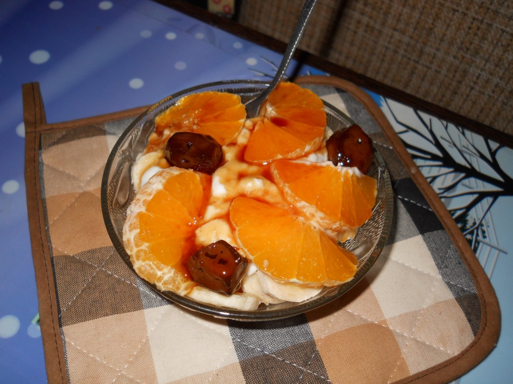 O reteta foarte usor de realizat: Decojim banana si portocala apoi le taiem felii. Intr-un bol de inghetata sau de salata, asezam un strat de felii de portocala, un strata de felii de banana, apoi un strat de iaur, si tot asa pana se umple bolul . La final ornam cu portocale si adaugam si lingurele de dulceata de nuci. Recomand cu drag reteta este foarte gustoasa, rapida si foarte usor de preparat. De asemenea recomand ca fructele si iaurtul sa stea la frigider in prealabil.Pofta Buna