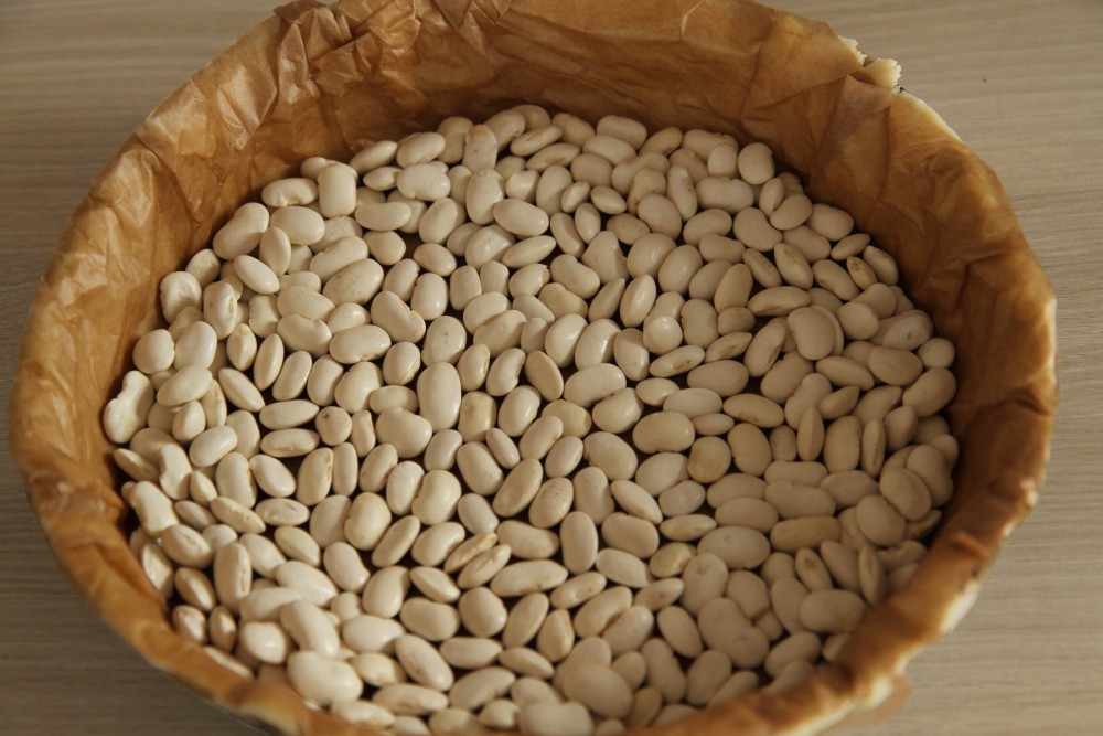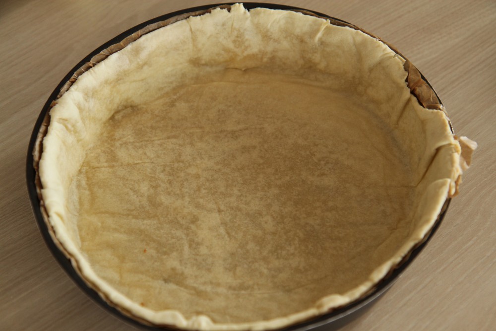 Aluat:Se amesteca faina cu untul rece de la frigider pana se fac firmituri. Se amesteca cu 2,3 linguri de apa pana se face un aluat omogen. Se infasoara in folie de plastic si se baga la frigider 30 min. Se scoate, se intinde pe o forma de tarta si se mai baga 20 min la frigider. Apoi se pune deasupra hartie de copt si pe ea boabe de orez sau fasole si se baga la cuptor incalzit 180 grade 15 min. Se scoate hartia si se mai lasa 15 min.