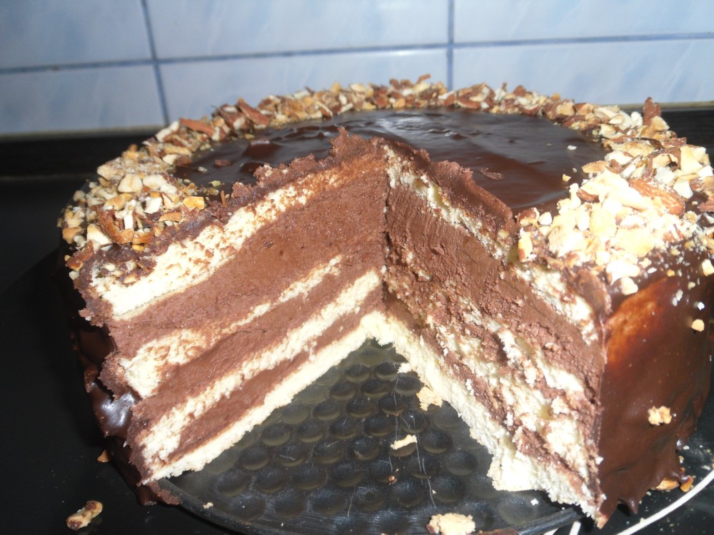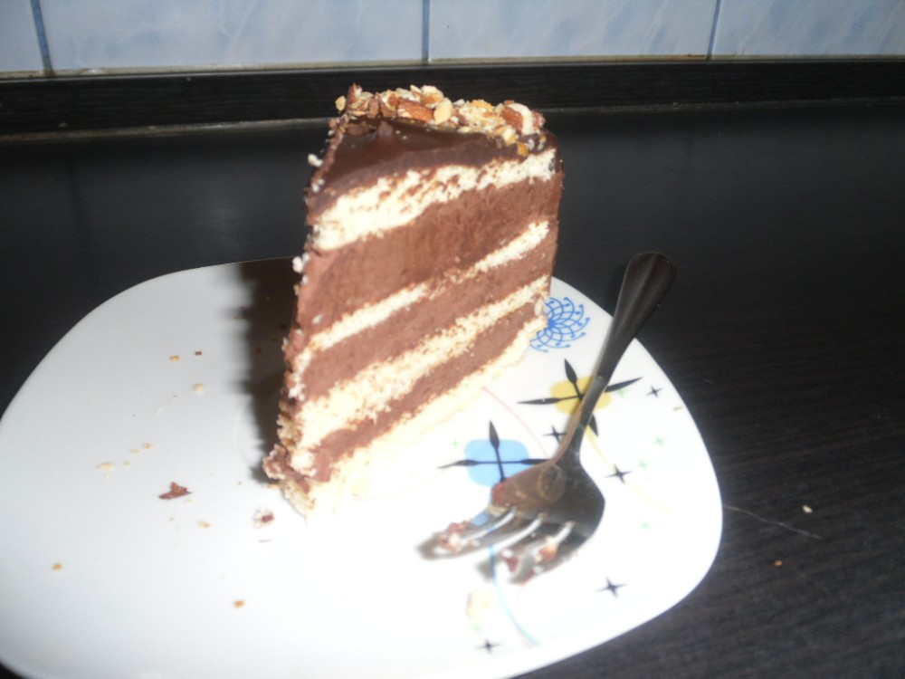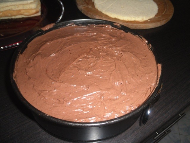 Se pune o foaie de blat, una de crema, una de blat , una de crema si una de blat la final. L-am bagat la rece si la cateva ore l-am scos sa il glazurez pe un gratar. Am topit ciocolata si am amestecat-o cu frisca lichida. Am glazurat si am ornat cu migdale sfarmate. A iesit unul din cele mai bune torturi ever!!!!!!!!